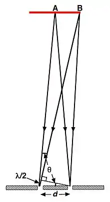 Dans les expériences historiques du XIXe siècle, on observait, avec un télescope muni d’un diaphragme portant deux trous distants de d, une source uniforme (en rouge). Si la source avait un diamètre apparent très petit, les rayons provenant de ses différents points arriveraient pratiquement en phase sur les deux trous et on observerait des franges d’interférence (trous d'Young). Mais si le diamètre apparent est plus grand, il y a destruction partielle des interférences. La figure est dessinée dans le cas où la destruction est totale : les rayons provenant du milieu A de la source arrivent en phase sur les deux trous, mais ceux qui arrivent du bord B arrivent déphasés de λ/2 et détruisent les franges provenant de A. Ceci se produit pour tous les couples de points de la source séparés angulairement de θ = λ/2d, soit pour une largeur angulaire de la source de λ/d, condition pour qu’il n’y ait pas de franges.
