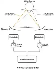 À présent, la détection interférométrique se fait à partir de plusieurs lunettes télescopiques (au minimum 2), reliées chacune à un détecteur de photon (photodiode) et à une horloge de précision atomique, puis à un calculateur permettant de recouper le degré de corrélation entre la donnée de détection d'un photon et son temps atomique; ce qui permet de déterminer la provenance géographique d'un photon d'une étoile distante, par rapport à la situation sur terre des télescopes d'observation (cf. schéma de gauche).