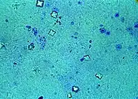 D'autres anomalies des examens de laboratoire peuvent suggérer une intoxication, en particulier la présence d'une acidose métabolique, notamment si elle se caractérise par un grand trou anionique. Cette acidose avec trou anionique est généralement présente dans la phase initiale de l'intoxication. Toutefois, il existe un grand nombre de diagnostics différentiels de l'acidose, y compris l'intoxication au méthanol, à l’acide salicylique, par le fer, l’isoniazide, le paracétamol, la théophylline, ou des troubles tels que l’urémie et l’acidocétose diabétique ou alcoolique. Le diagnostic d'intoxication par l'éthylène glycol doit être évoquée chez le patient présentant une forte acidose[5]. L’examen au microscope des urines peut révéler des cristaux d'oxalate de calcium en forme d’aiguilles ou d'enveloppe qui peuvent orienter vers le diagnostic, même si ces cristaux peuvent être absents jusqu'à la dernière étape de l'intoxication[22]. Enfin, de la fluorescéine a été ajoutée à de nombreux produits antigels pour permettre aux fuites de radiateur d'être détectées au moyen d’une lampe de Wood. Après l'ingestion de produits antigels contenant de l'éthylène glycol et de la fluorescéine, une lampe de Wood peut révéler une fluorescence de la bouche d'un patient, de ses vêtements, des vomissements, ou des urines qui peut aider au diagnostic de l’intoxication[23],[24].