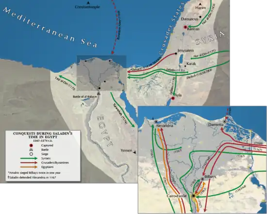 Il s'ensuit une succession d'interventions de la part d'Alep et de Jérusalem, assortie de trêves, chaque camp voulant éviter que l'autre ne s'installe durablement dans la vallée du Nil. Cependant, des maladresses des croisés finirent par favoriser l'arrivée au pouvoir en Égypte de Saladin, le neveu de Shirkuh.