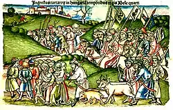À la moitié du XIVe siècle, l'emprise de la Horde d'or sur l'Europe centrale et orientale commence à s'affaiblir. Plusieurs royaumes européens commencent à lancer des incursions dans les terres contrôlées par les Mongols, dans le but de reconquérir les territoires précédemment perdus et de s'en emparer d'autres. Des groupes de Tatars, en butte à l'hostilité des paysans sédentaires dont ils avaient pillé les ancêtres, deviennent eux-mêmes cultivateurs et éleveurs et choisissent l'assimilation. Dans certains cas, l'assimilation est partielle car les Tatars deviennent mercenaires des princes chrétiens mais gardent leur langue et leur religion (tengrisme ou islam) : c'est par exemple le cas des Tatars de Podlachie. Dans d'autres cas, elle est totale : les familles tatares choisissant de passer au christianisme et devenant moldaves (famille Cantemir) ou russes (familles Tazi ou Fasli)[68],[69]. Les Roms aussi, jusque-là charrons, maquignons, maréchaux-ferrants, chaudronniers, tanneurs, et éclaireurs des Tatars (татаритика Рома : « Roms des Tatars »), choisissent d'offrir leurs services aux princes (халадитика Рома : « Roms princiers » ou « militaires ») et aux monastères (монастыртика Рома) russes, moldaves, valaques, hongrois ou tchèques (d'où leur surnom de « Bohémiens » en Occident)[70].