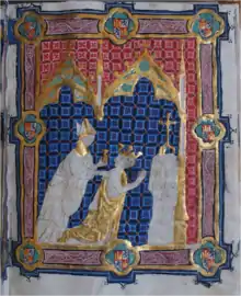 En 1286, Alphonse III fixa les quatre éléments constitutifs du rituel d'investiture : onction, couronnement, adoubement et enfin serment mutuel de loyauté entre le souverain et ses sujets. S'écartant de tout intermédiaire civil ou ecclésiastique pour l'acquisition de son statut royal, la cérémonie accorde une bonne place à l'idéologie guerrière (marquée par la place importante de l'épée parmi les regalias) et se rapproche des cérémonies castillanes (notamment l'adoubement par un automate de saint Jacques)[15]. La prestation de serment reconnait les Fueros aragonais, considérés comme base de l'ensemble juridique, et le souverain jure solennellement de les maintenir en vigueur.