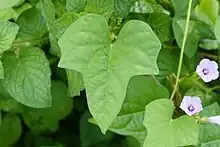 Les tiges, prostrées ou grimpantes, volubiles, sont généralement très ramifiées, et peuvent atteindre 3 mètres de long. Elles sont glabres ou parfois un peu pubescentes, et plus densément pubescentes au niveau des nœuds. Les feuilles simples, alternes, sont pétiolées. Le limbe foliaire, à la base cordée, de 2 à 12 cm de long sur 2 à 10 cm de large, a un contour ovale à orbiculaire. La marge est entière, grossièrement dentée ou profondément lobée, avec 3 à 5 lobes. Le lobe médian est ovale à lancéolé[3],[4].