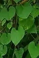 Les pétioles mesurent de 4 à 9 cm de long. Les feuilles inférieures sont triangulaires à base subtronquée, acuminées, et mesurent de 6 à 8 cm de long, tandis que les feuilles supérieures sont plutôt ovoïdes (ovées ou ovées triangulaires), avec une base cordée et un apex atténué à subacuminé et une marge entière, pour 5 à 7 cm de long[1].