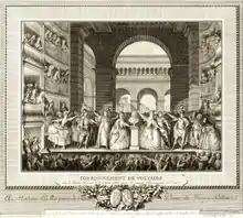 Ce n’est qu’à la sixième, le , qu’âgé de 84 ans très malade, Voltaire a pu assister à son triomphe. Les abords pour la Comédie-Française étaient encombrés d’une foule impatiente de le contempler. Dès que sa voiture est apparue, un immense cri de joie a retenti aux acclamations de : vive Voltaire ! à n’en plus finir. Lorsqu’il est descendu de son carrosse, la foule voulait le porter en triomphe, et on a eu de la peine à l’en arracher. À son entrée à la Comédie[n 2], il a été dirigé vers la loge des gentilshommes de la chambre, en face de celle du comte d’Artois[7]. Une fois installé au premier rang auprès des dames[n 3]. Alors on a crié : « la Couronne ! » et le comédien Brizard est venu la lui mettre sur la tête : « Ah Dieu ! vous voulez donc me faire mourir ! » s’écriait Voltaire, pleurant de joie et se refusant à cet honneur. Il a pris cette couronne à la main et l’a présentée à Belle et Bonne, qui la refusait, lorsque le prince de Bauveau, saisissant le laurier, l’a remis sur la tête du poète, qui n’a pu résister cette fois. Une fois la pièce jouée et le rideau tombé, celui-ci s’est relevé, montrant le buste de Voltaire, qui avait été placé depuis peu dans le foyer de la Comédie-Française. Le buste avait été apporté au théâtre et élevé sur un piédestal : tous les comédiens l’entouraient en demi-cercle, des palmes et des guirlandes à la main. Une couronne était déjà sur le buste, et Rose Vestris a lu ces vers, improvisés par le marquis de Saint-Marc[8] :
