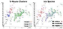 L'utilisation de cet ensemble de données dans l'analyse est cependant rare, puisqu'il ne contient que deux clusters avec une séparation plutôt évidente. L'un des groupes contient l'Iris setosa, tandis que l'autre groupe contient à la fois l'Iris virginica et l'Iris versicolor; ce dernier groupe n'étant pas séparable sans information sur l’espèce que Fisher a utilisée. Cela fait de ce jeu de données un bon exemple pour expliquer la différence entre apprentissage supervisé et apprentissage non supervisé en fouille de données (data mining) : le modèle d'analyse discriminante linéaire de Fisher ne peut être obtenu que lorsque les espèces sont connues : les étiquettes de classe et les classes ne sont pas nécessairement les mêmes[5].