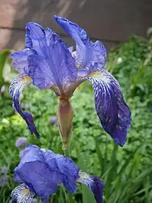 - Iris 'Amas' (Iris ×germanica nothovar. macrantha) : pétales bleu clair. Sépales bleu violet à onglets blancs veinés violet, barbe bleu pâle à pointe orange. Originaire de la région d’Amasia au nord de la Turquie. Utilisée dans l'obtention des iris à grandes fleurs tétraploïdes, au début du XXe siècle.
