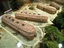 Les Iroquoiens de la vallée du Saint-Laurent vivent en communauté[10], et plusieurs familles habitent dans une même maison longue. Les demeures sont parfois protégées du vent, des animaux sauvages et des autres nations iroquoiennes ou algonquiennes, par des palissades. D'une largeur de six à sept mètres, la longueur d’une maison longue dépend du nombre de familles à accueillir. Elle peut atteindre plus de trente mètres afin d'abriter jusqu'à une dizaine de familles se partageant cinq foyers[11].