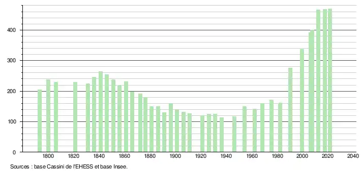 L'évolution du nombre d'habitants est connue à travers les recensements de la population effectués dans la commune depuis 1793. Pour les communes de moins de 10 000 habitants, une enquête de recensement portant sur toute la population est réalisée tous les cinq ans, les populations légales des années intermédiaires étant quant à elles estimées par interpolation ou extrapolation[20]. Pour la commune, le premier recensement exhaustif entrant dans le cadre du nouveau dispositif a été réalisé en 2007[21].