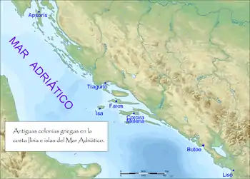 Carte des anciennes colonies grecques en Illyrie et dans l'Adriatique avec l'emplacement de Isa.