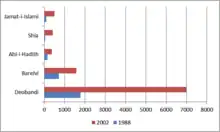 Le sunnisme d'école hanafite se partage entre deux grands courants : celui des barelvi, d'imprégnation soufie, et celui des déobandi, plus littéraliste et puriste, chacun ayant son propre réseau de mosquées. Il est difficile d'évaluer la proportion respective de ces deux courants. Global Security estime la répartition des musulmans pakistanais à 50 % de barelvis, 20 % de déobandis, 18 % de chiites, 4 % d'Ahl al-Hadiths (déclinaison locale du courant salafiste), 2 % d'ismaéliens, 2 % d'ahmadites et 2 % d'autres courants[6]. Le Centre International de la Violence Politique et du Terrorisme, de l'Université de Technologies de Nanyang à Singapour, estime la population musulmane du Pakistan composée à 60 % de barelvis soufis, 15 % de déobandis, 20 % de chiites, 4 % d'Ahl-al-Hadith et 1 % d'autres courants[7].