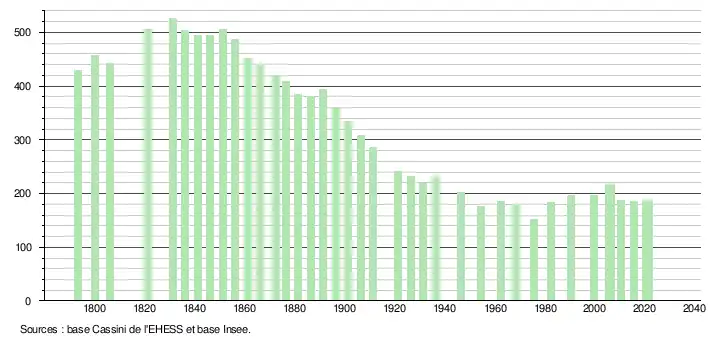 L'évolution du nombre d'habitants est connue à travers les recensements de la population effectués dans la commune depuis 1793. Pour les communes de moins de 10 000 habitants, une enquête de recensement portant sur toute la population est réalisée tous les cinq ans, les populations légales des années intermédiaires étant quant à elles estimées par interpolation ou extrapolation[15]. Pour la commune, le premier recensement exhaustif entrant dans le cadre du nouveau dispositif a été réalisé en 2005[16].