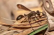 Cette guêpe solitaire, entièrement noire, mesure de 10 à 30 mm de long. Le thorax et la tête sont couverts en partie d'une pilosité blanche. Les ailes sont fumées. L'abdomen est relié au thorax par un long pétiole courbe. Les femelles sont plus grosses que les mâles et émergent plus tard que ceux-ci[1].