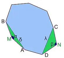 Lemme 2 — Si un polygone à n côtés est solution du problème isopérimétrique, les angles entre deux côtés partageant un même sommet sont égaux.
