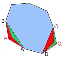 La lettre n désigne un entier plus grand que 2 et p un nombre réel strictement positif. La question à résoudre est de trouver, s'il existe, le polygone à n côtés et de périmètre p, ayant la plus grande aire. On peut remarquer qu'il suffit de chercher uniquement dans les polygones convexes. Le terme convexe signifie ici qu'un élastique entourant le polygone est toujours en contact avec sa frontière. Considérons, en effet, un polygone non convexe P1, par exemple celui illustré sur la figure de droite, en bleu. Son enveloppe convexe, c'est-à-dire la figure ayant pour frontière celle donnée par un élastique entourant le polygone P1, est un nouveau polygone P2, cette fois convexe. Le polygone P2 correspond à celui contenant les zones bleue et verte sur la figure. Son aire est strictement plus grande et son périmètre strictement plus petit. Une dilatation d'un rapport bien choisi, nécessairement supérieur à 1, appliquée à P2 définit un nouveau polygone P3 de même périmètre que celui de P1. L'aire de P1 est strictement plus petite que celle de P2, elle-même strictement plus petite que celle de P3. Le polygone P3 est de même périmètre que P1 et d'aire strictement plus grande. On en déduit que P1 n'est pas un candidat pour répondre au problème isopérimétrique.