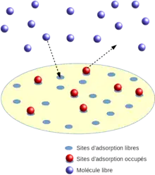 Le modèle de Langmuir met en équation l'équilibre entre l'adsorption et la désorption de molécules pour calculer la proportion de sites occupés . Pour une température donnée, cette grandeur est liée à la pression partielle (ou à la concentration) en dans la phase fluide selon :