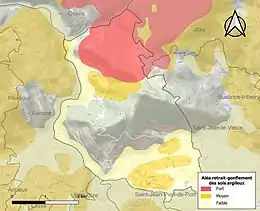 Le retrait-gonflement des sols argileux est susceptible d'engendrer des dommages importants aux bâtiments en cas d’alternance de périodes de sécheresse et de pluie[45]. 35,1 % de la superficie communale est en aléa moyen ou fort (59 % au niveau départemental et 48,5 % au niveau national)[Carte 5]. Depuis le , en application de la loi ELAN, différentes contraintes s'imposent aux vendeurs, maîtres d'ouvrages ou constructeurs de biens situés dans une zone classée en aléa moyen ou fort[Note 8],[46].