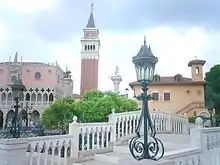 Le pavillon de l'Italie à Epcot, ouvert avec le parc le , s'organise autour de deux places qui reprennent l'architecture de la place Saint-Marc à Venise avec son Campanile et le Palais des Doges ainsi que la Piazzetta[1],[2] mais avec deux différences notables, le pavillon est construit comme le reflet dans un miroir de la place réelle et aussi en taille réduite[3].