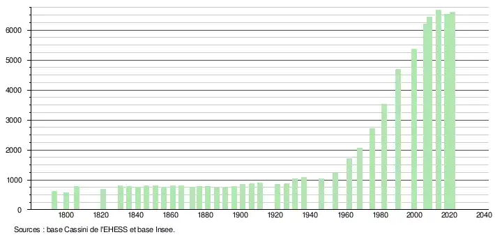 L'évolution du nombre d'habitants est connue à travers les recensements de la population effectués dans la commune depuis 1793. Pour les communes de moins de 10 000 habitants, une enquête de recensement portant sur toute la population est réalisée tous les cinq ans, les populations légales des années intermédiaires étant quant à elles estimées par interpolation ou extrapolation[34]. Pour la commune, le premier recensement exhaustif entrant dans le cadre du nouveau dispositif a été réalisé en 2008[35].