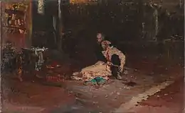 Bien que le titre donné en France au tableau soit Ivan le Terrible tue son fils[Note 4], Répine ne peint pas le moment où le tsar porte un coup au tsarévitch[28]. La toile ne représente pas la violence, mais sa résolution. Ivan le Terrible a relevé son fils. Les yeux « exorbités par l'horreur, le désespoir et la folie »[29], il l'enserre et l'étreint par la taille. Le tsarévitch Ivan, pleurant, fait doucement un geste de sa main[30].