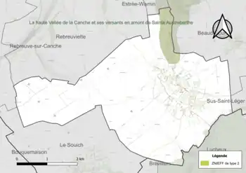 Le territoire communal comprend une ZNIEFF de type 2[Note 2] : la haute vallée de la Canche et ses versants en amont de Sainte-Austreberthe qui se situe dans le pays du Ternois. Il offre un relief de coteau abrupt au Nord et des pentes douces au Sud. Le fond de vallée est constitué de pâturages et de zones de cultures. Les versants les plus pentus et inaccessibles accueillent des boisements[10].
