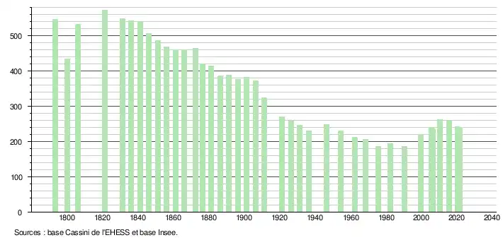 L'évolution du nombre d'habitants est connue à travers les recensements de la population effectués dans la commune depuis 1793. Pour les communes de moins de 10 000 habitants, une enquête de recensement portant sur toute la population est réalisée tous les cinq ans, les populations légales des années intermédiaires étant quant à elles estimées par interpolation ou extrapolation[29]. Pour la commune, le premier recensement exhaustif entrant dans le cadre du nouveau dispositif a été réalisé en 2005[30].