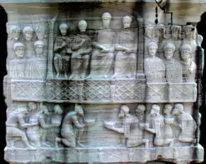 - La comparaison thématique avec les reliefs de l'arc de Galère se justifie d'autant plus qu'il s'agit d'un monument célébrant également un triomphe impérial, celui de l'empereur Galère vainqueur de la Perse en 297.