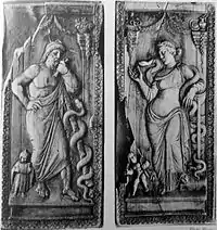 Parallèlement, on assiste à l'avènement du grand empire byzantin. Au IVe siècle, Constantin le grand fonde Constantinople et installe la nouvelle religion chrétienne dans sa capitale. Il fait bâtir le Saint-Sépulcre ou la cathédrale de Trèves[12]. Ce siècle voit s'élaborer la doctrine chrétienne qui se propage à travers les deux grands empires. Elle est faite religion d'État à la mort de Théodose en 395 et l'empereur en est le régisseur suprême. Elle a d’emblée un pouvoir lié à l'empereur. L'ivoire a donc été tout naturellement réquisitionné dans ce domaine et autour de 400, émerge un sous-type : les diptyques liturgiques au dos desquels on inscrivait le nom des martyrs priés ou des donateurs. Sur le diptyque représentant Saint-Paul (daté du début du Ve siècle), on observe le même attachement aux principes antiques. Les formules sont les mêmes, on les adapte aux différents besoins.
