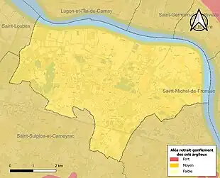 La commune fait partie du territoire à risques importants d'inondation (TRI) de Libourne, regroupant les 20 communes concernées par un risque de submersion marine ou de débordement de la Dordogne, un des 18 TRI qui ont été arrêtés fin 2012 sur le bassin Adour-Garonne[39]. Les événements significatifs aux XIXe et XXe siècles sont les crues de 1843 (6,80 m l'échelle de Libourne), de 1866 (6,40 m) et du (6,38 m) et du (6,36 m). Au XXIe siècle, les événements les plus marquants sont les crues de mars 2010 (5,55 m) et du (5,97 m). Des cartes des surfaces inondables ont été établies pour trois scénarios : fréquent (crue de temps de retour de 10 ans à 30 ans), moyen (temps de retour de 100 ans à 300 ans) et extrême (temps de retour de l'ordre de 1 000 ans, qui met en défaut tout système de protection)[40]. La commune a été reconnue en état de catastrophe naturelle au titre des dommages causés par les inondations et coulées de boue survenues en 1982, 1983, 1993, 1999, 2009, 2013, 2020 et 2021[41],[37].