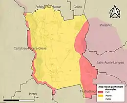 Le retrait-gonflement des sols argileux est susceptible d'engendrer des dommages importants aux bâtiments en cas d’alternance de périodes de sécheresse et de pluie. La totalité de la commune est en aléa moyen ou fort (94,5 % au niveau départemental et 48,5 % au niveau national). Sur les 160 bâtiments dénombrés sur la commune en 2019, 160 sont en aléa moyen ou fort, soit 100 %, à comparer aux 93 % au niveau départemental et 54 % au niveau national. Une cartographie de l'exposition du territoire national au retrait gonflement des sols argileux est disponible sur le site du BRGM[27],[Carte 3].
