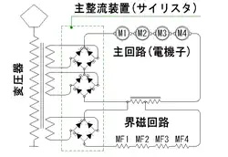 Le redresseur du circuit principal est un système entièrement à thyristors qui n'utilise pas de diodes et, lors de l'utilisation du freinage par récupération, il fonctionne comme un onduleur qui convertit le courant continu généré par le moteur en courant alternatif injectable dans la catenaire.