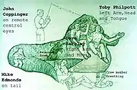Cette lourde configuration explique que l'on ne voit pas Jabba se déplacer dans l'épisode VI, mais aussi le fait qu'il est toujours fixé sur une estrade, permettant de dissimuler l'opérateur chargé de la respiration.