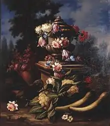 - Nature morte de fruits et fleurs dans un décor de jardin.