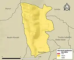 Le retrait-gonflement des sols argileux est susceptible d'engendrer des dommages importants aux bâtiments en cas d’alternance de périodes de sécheresse et de pluie. La totalité de la commune est en aléa moyen ou fort (44,5 % au niveau départemental et 48,5 % au niveau national). Sur les 36 bâtiments dénombrés sur la commune en 2019, 36 sont en aléa moyen ou fort, soit 100 %, à comparer aux 75 % au niveau départemental et 54 % au niveau national. Une cartographie de l'exposition du territoire national au retrait gonflement des sols argileux est disponible sur le site du BRGM[22],[Carte 3].