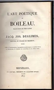 - 1817 : L'art poétique de Boileau. Traduction en vers latins par Jacq. Jos. Deglimes, principal du collège de Tirlemont, dédiée a M.. Jean-Baptiste Lesbroussart, professeur de rhétorique au Collège royal de Bruxelles, et membre de l’Académie de la même ville, Bruxelles, P.J. De Mat, imprimeur de l'Académie royale, 1817.