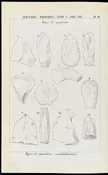 À cette époque, les découvertes d'ossements fossiles se multiplient dans les tourbières et sablières. Boucher de Perthes décèle dès 1828 des anomalies, en particulier des silex avec deux éclats façonnés par la main de l'homme, dans un banc tertiaire (il considère que ce banc est antédiluvien) d'alluvions des bords de la Somme à Abbeville[4]. En 1844, il découvre dans les couches les plus anciennes de la terrasse de Menchecourt-lès-Abbeville (alluvions de la Somme) des outils en silex à côté d'ossements de grands mammifères disparus qu'il date du Pléistocène (période comprise entre 2,58 millions et 11 700 ans avant le présent). Il rédige plusieurs ouvrages entre 1846 et 1864, notamment Antiquités celtiques et antédiluviennes, dans lequel il raconte ses découvertes et démontre que deux industries se sont succédé dans le temps comme se superposent les deux strates des terrains qu'il a fouillés. La strate la plus récente se caractérise par des pierres polies et la précédente par des silex taillés contemporains d'ossements de mammouths et de rhinocéros nain. Ainsi l'étude chronologique des couches permet de donner une datation relative des vestiges retrouvés. Boucher de Perthes démontre qu'à une période très ancienne existait déjà un homme « préhistorique ». Cette découverte rouvre le débat sur l'antiquité de l'homme.