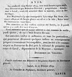 Les autorités civiles et militaires, et tous les particuliers, qui pourraient découvrir quelques indices ou renseignements propres à convaincre les coupables, sont invités à les communiquer au Procureur du Roi près le tribunal de première instance de Laval, département de la Mayenne, soussigné. »