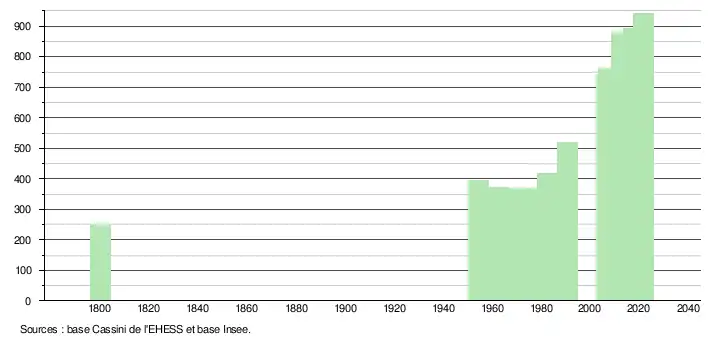 L'évolution du nombre d'habitants est connue à travers les recensements de la population effectués dans la commune depuis 1800. Pour les communes de moins de 10 000 habitants, une enquête de recensement portant sur toute la population est réalisée tous les cinq ans, les populations légales des années intermédiaires étant quant à elles estimées par interpolation ou extrapolation[17]. Pour la commune, le premier recensement exhaustif entrant dans le cadre du nouveau dispositif a été réalisé en 2007[18].