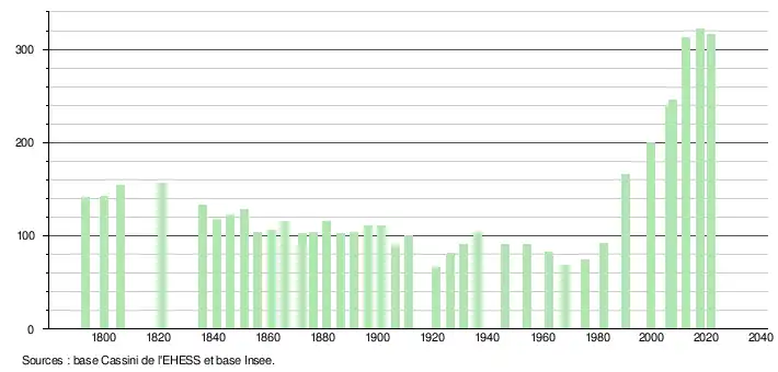 L'évolution du nombre d'habitants est connue à travers les recensements de la population effectués dans la commune depuis 1793. Pour les communes de moins de 10 000 habitants, une enquête de recensement portant sur toute la population est réalisée tous les cinq ans, les populations légales des années intermédiaires étant quant à elles estimées par interpolation ou extrapolation[22]. Pour la commune, le premier recensement exhaustif entrant dans le cadre du nouveau dispositif a été réalisé en 2007[23].