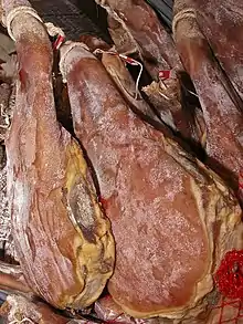 Une fois les jambons reçus de l'abattoir, la transformation peut commencer. Dans un premier temps les cuisses sont découpées et parées en arrondi. Ensuite elles sont frottés à la main avec un mélange de sel, de salpêtre, de poivre et d'épices[3].