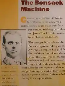 Dans les années 1870, le procédé manuel était trop lent pour satisfaire la demande, et une compagnie de Richmond a offert un prix pour celui qui serait capable de concevoir une machine. Bonsack a relevé le défi, mais son premier prototype a été détruit par un incendie. Il le reconstruit et dépose un brevet en . Sa machine permettait de produire 200 cigarettes par minute, soit 120 000 par jour, ce qui a révolutionné l'industrie du tabac[1], et donna un quasi-monopole à l'American Tobacco Company (en) et à son propriétaire l'industriel James Buchanan Duke[2]. James Albert Bonsack est mort le 1 Juin 1924 des suites d'un cancer des poumons.