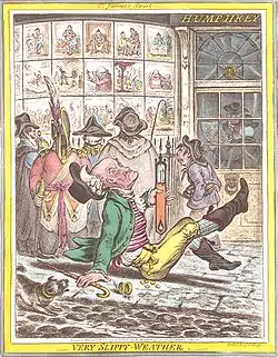 Le nom de l'éditeur et vendeur des œuvres de Gillray, Miss Hannah Humphrey, sœur du graveur William Humphrey, et dont la boutique était installée au 227 du Strand puis successivement sur New Bond street, Old Bond Street et enfin St. James's Street, est intimement associé à celui du caricaturiste. En effet, Gillray a vécu avec Miss (souvent appelée Mme) Humphrey pendant toute sa période de célébrité. On pense que plusieurs fois il aurait voulu l’épouser et qu’à une occasion, le couple était sur le chemin de l'église quand Gillray déclara : « Cette affaire est insensée, lorsqu’on y pense, Miss Humphrey. Nous vivons très confortablement ensemble, ne ferions nous pas mieux de rester célibataires ? ». Rien n’est cependant prouvé qui puisse donner du crédit aux paroles ici rapportées, mais le couple vivait bien ensemble. Les plaques de Gillray étaient exposées dans la vitrine d'Hannah Humphrey devant laquelle se pressait une foule impatiente. Une de ses dernières estampes, Un temps très glissant, représente la boutique de Mme Humphrey de St. James's Street à l'arrière-plan. Dans la vitrine on reconnaît un certain nombre des tirages de Gillray publiés antérieurement, tels que Tiddy-Doll le grand fabricant français de pain d'épices, immortalisant une nouvelle série de rois ; Son ouvrier, Talley mélangeant la pâte, une satire sur la propension de faiseur de roi de Napoléon, également représenté dans la vitrine.