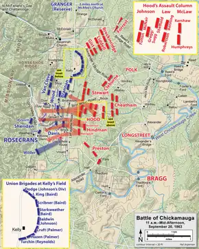 Lorsque les deux hommes se rencontrent enfin au quartier général de Bragg, tard dans la nuit, ce dernier confie à Longstreet le commandement de l'aile gauche de son armée et au lieutenant général Leonidas Polk celui de l'aile droite. Le commandement de Longstreet se compose du corps de Simon Bolivar Buckner, Sr., sous lequel se trouvent les divisions d'Alexander Peter Stewart, de William Preston, de Bushrod Rust Johnson, de Thomas C. Hindman et de John Bell Hood. La division de McLaws est placée sous le commandement de Longstreet mais n'arrive complètement de Virginie que le 21 septembre, après la fin de la bataille de Chickamauga. Joseph Brevard Kershaw est placé à la tête de ses deux brigades qui se trouvent sur le terrain. Bragg élabore un plan d'attaque pour 8 h du matin le 20 septembre. Longstreet aligne la plupart de ses hommes sur deux lignes, mais il place la division de Hood derrière celle de Johnson dans une colonne, afin qu'elle servent de troupes de choc[199],[200]. L'attaque est censée commencer tôt dans la matinée, peu après un assaut de l'aile de Polk. Cependant, la confusion et des ordres mal gérés retardent l'attaque de Polk, et l'avance de Longstreet ne commence que juste après 11 h après avoir entendu des tirs sur sa gauche[201]. Un ordre erroné du général Rosecrans provoque une brèche dans la ligne de l'Union en transférant la division de Thomas John Wood de la droite pour renforcer le XIVe Corps de George Henry Thomas au centre[202].
