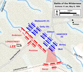 Les hommes de Longstreet avancent le long de l'Orange Plank Road contre le IIe Corps et, en 2 h, le chassent presque du champ de bataille. Il met au point des tactiques pour faire face aux difficultés du terrain, ordonnant l'avancée de six brigades via des lignes de tirailleurs, ce qui permet à ses hommes de tirer en continu sur l'ennemi tout en limitant la capacité de riposte par l'espacement entre les hommes. L'historien Edward Steere attribue une grande partie du succès de l'armée à « la démonstration du génie tactique de Longstreet qui a plus que compensé sa disparité en termes de force numérique »[238]. Après la guerre, Hancock dit à Longstreet à propos de cette manœuvre de flanc : « Vous m'avez roulé comme une couverture mouillée »[239].
