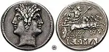 Qu'en est-il de la surprenante association entre le temps et la nef ? L'as d'airain, l'unité monétaire de Rome, est orné du Janus bifrons et d'une proue de navire. Jouer à pile ou face se dit capita aut navia? (« têtes ou nef ? »)[23]. Le navire n'est pas le seul revers de la pièce (voir illustration) ; et les autres monnaies romaines portent aussi une nef au revers (voir illustration). L'association iconologique entre le dieu et le navire est motivée par le concept de « passage » et de traversée du Tibre[24] et intimement liée à Portunus, le dieu des ports, alors que Janus est celui des portes[24]. Le Janiculum se trouve « au-delà du Tibre » par rapport au Capitole. le Tibre constituait une frontière naturelle de Rome avec l'Étrurie. De là la description ovidienne de Janus comme roi étrusque[24]. Cette association entre Janus et le passage du Tibre, explique l'érection, par Caius Duilius, d'un temple dédié à Janus, après sa victoire navale, la première que remportent les Romains, à la bataille de Mylae[24]. Ce temple a été inauguré le , le jour des Portunalia, fête de Portunus[24]. Pline note sèchement : « le poids réel de la livre de cuivre fut diminué durant la première guerre punique, la République ne pouvant faire face à ses dépenses ; et il fut décrété qu'on frapperait des as de deux onces. On gagna de la sorte cinq sixièmes, et on liquida les dettes. La marque de ces nouveaux as fut sur une face un Janus à deux faces, sur l'autre un éperon de navire. »