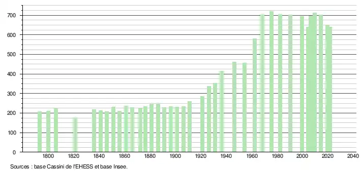 L'évolution du nombre d'habitants est connue à travers les recensements de la population effectués dans la commune depuis 1793. Pour les communes de moins de 10 000 habitants, une enquête de recensement portant sur toute la population est réalisée tous les cinq ans, les populations légales des années intermédiaires étant quant à elles estimées par interpolation ou extrapolation[32]. Pour la commune, le premier recensement exhaustif entrant dans le cadre du nouveau dispositif a été réalisé en 2004[33].