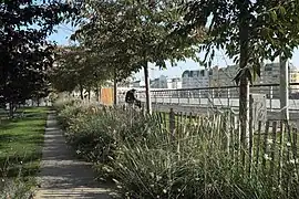 Il compte des pelouses accessibles, des massifs plantés et un jardin partagé. Il est agrémenté de 68 arbres, dont 46 fruitiers, et propose également une fontaine d'eau potable, un espace solarium et une aire de jeux pour les enfants[1].
