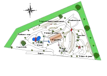 Dans ce jardin se trouvent diverses constructions telles que des bancs (4), des petits ponts (3) ou des escaliers.
