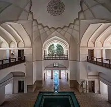 Le bâtiment d'entrée, qui comprend deux niveaux, repose sur des fondations de gravats, liés par du mortier à la chaux. Le plafond de l'entrée est décoré de motifs géométriques en stuc. La porte en bois donne accès à une pièce, la salle d'entrée proprement dite (hashti), dont le plafond est décoré de tuiles et de briques cuites. On trouve également plusieurs pièces latérales et un corridor qui donne accès au jardin. À l'étage se trouve une vaste chambre aux portes sculptées de motifs tressés. De chaque côté de la porte principale, des entrées plus petites sont utilisées pour le passage des animaux domestiques[3].