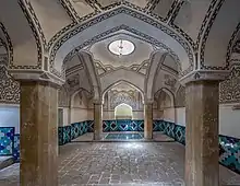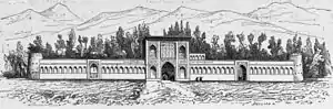 L'entrée principale se trouve dans le mur nord-ouest du jardin. Construit à l'époque safavide, le bâtiment fut considérablement restauré à l'époque qajar, en particulier sous la direction du ministre Mirza Mahmud Ehtesham ol-Saltaneh, au début du XXe siècle.